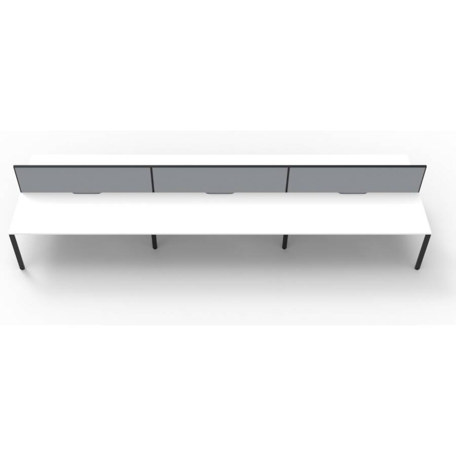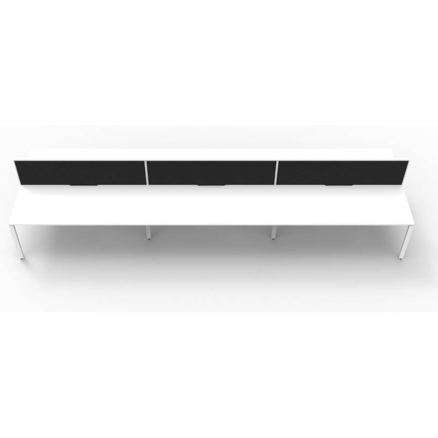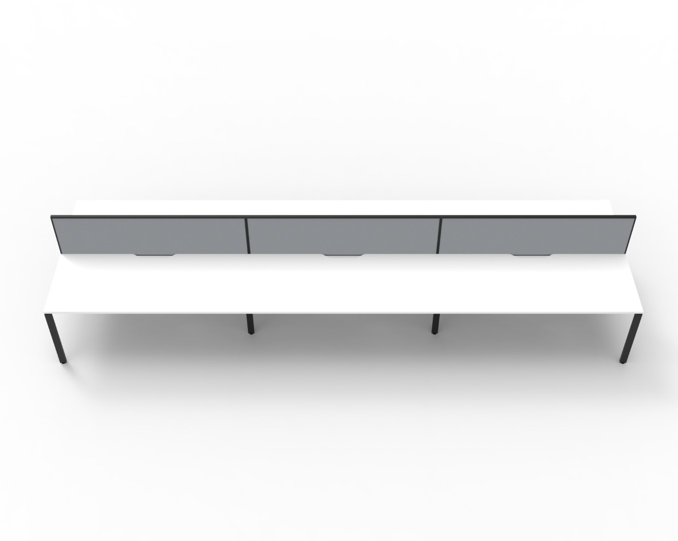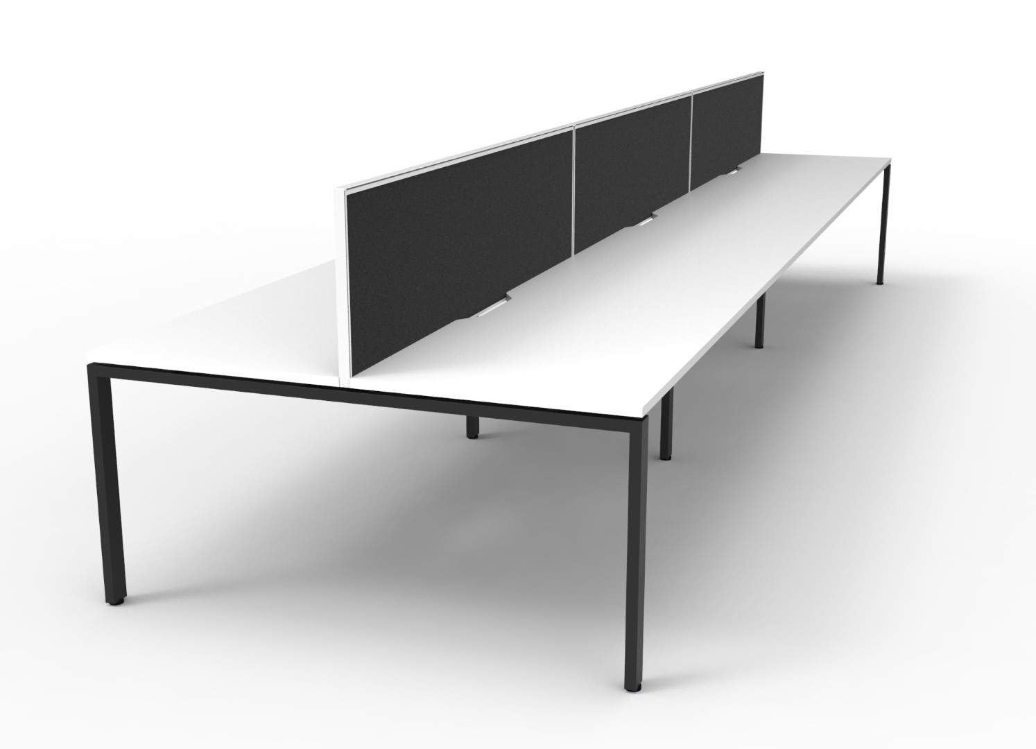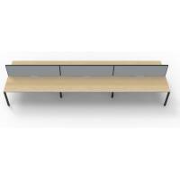 3600mm W x 1530mm D x 1200mm H (Overall), 1200mm W x 750mm D x 730mm H (Per User), 60mm x 30mm Profile Leg Underframe. 495mm H x 30mm T Pinnable Privacy Screen Upholstered In Fabric
