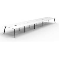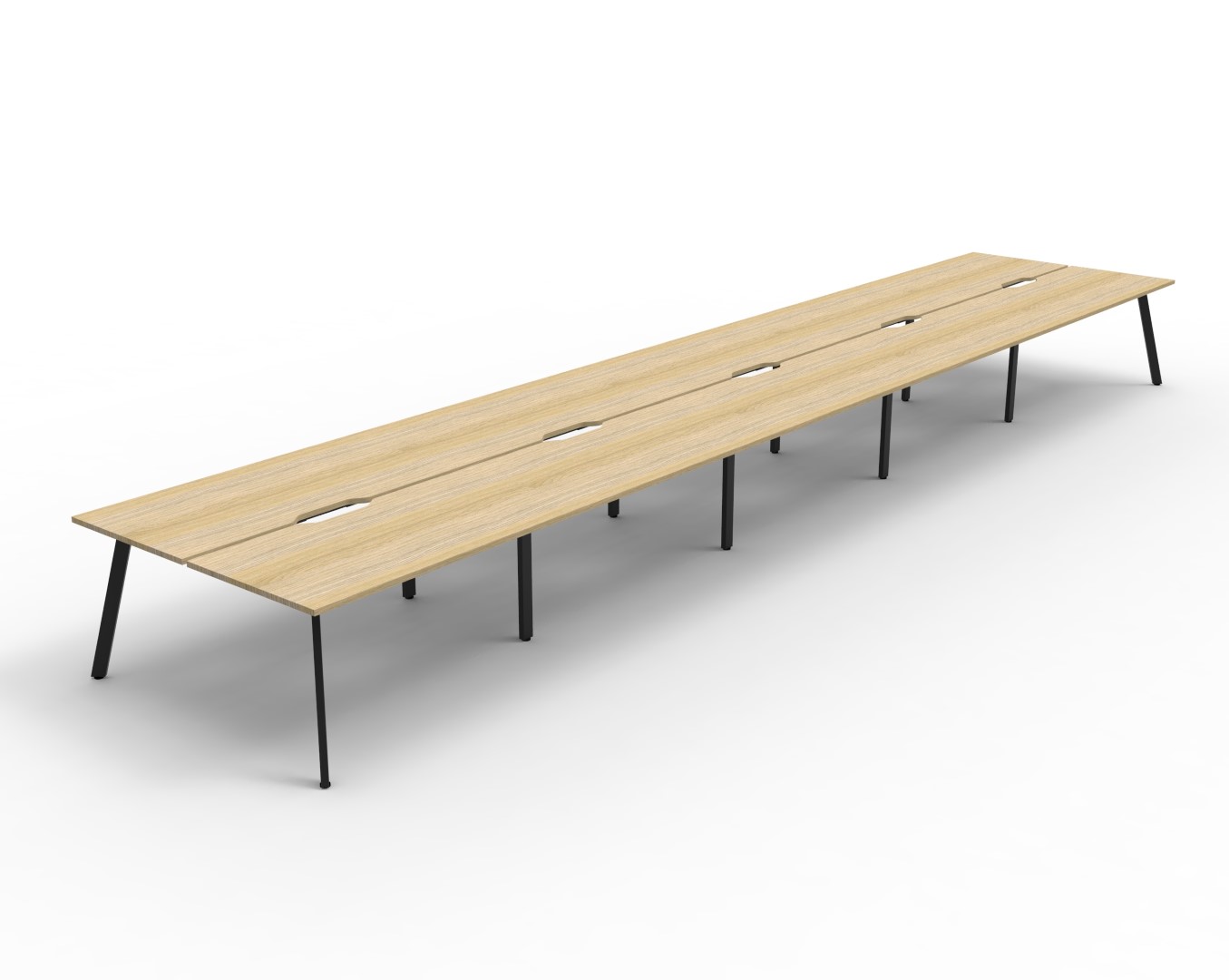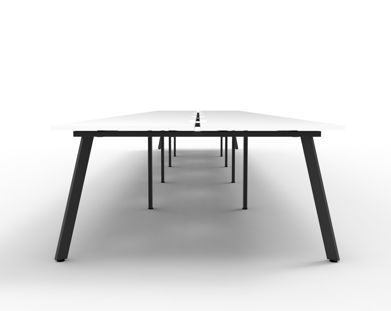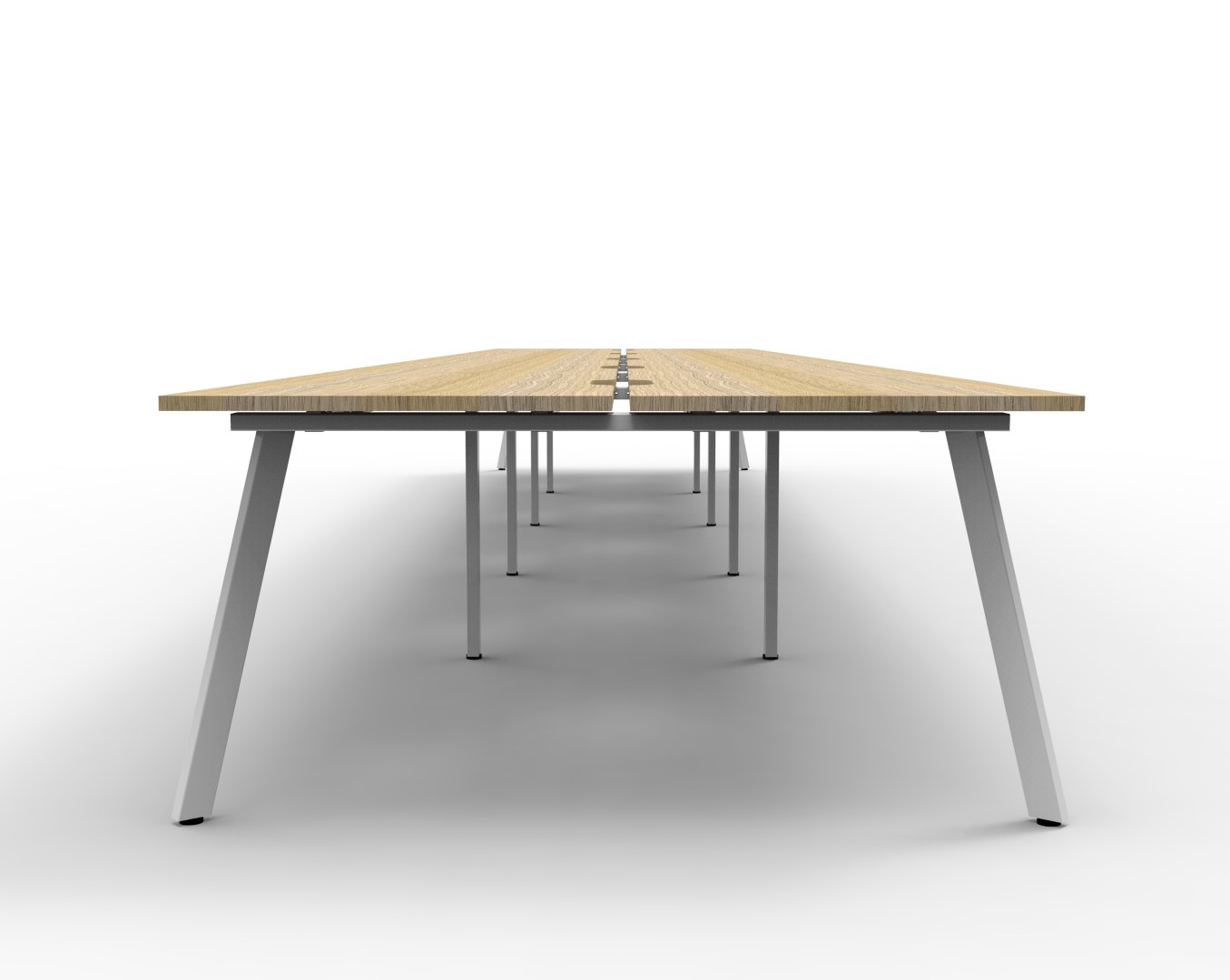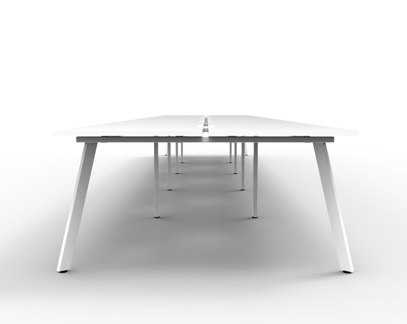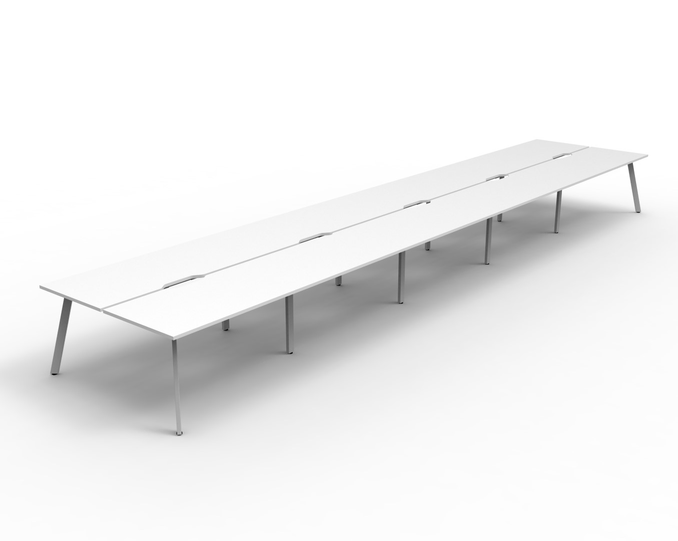 Eternity 10 Person Double Sided Workstation – No Screen | E0 Enviroboard Top With 410mm W x 50mm D Scallop | 30mm Cable Access Void In Between Double Sided Users – Infill Rail Avail. At An Additional Cost | 7500mm W x 1530mm D x 730mm H ( Overall ), 1500mm W x 750mm D x 730mm H Per User | 60mm x 30mm Splayed Leg, P/C Underframe | Adjustable Levelling Feet|Dual Cross Bar For Added Stability