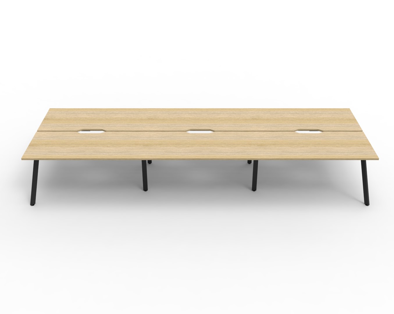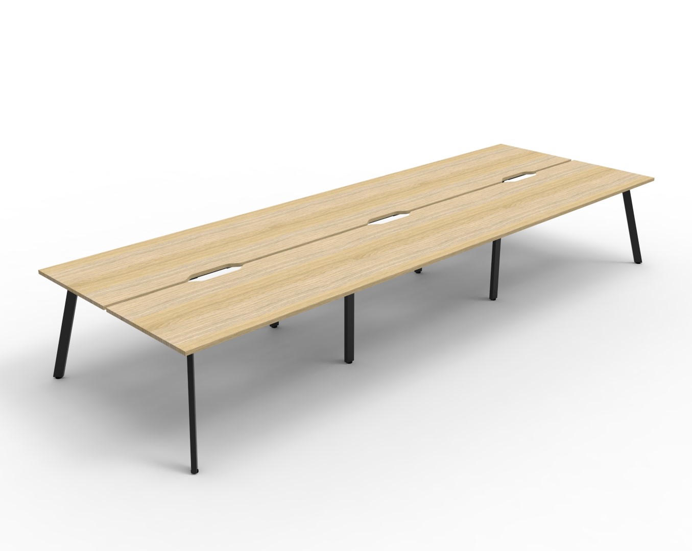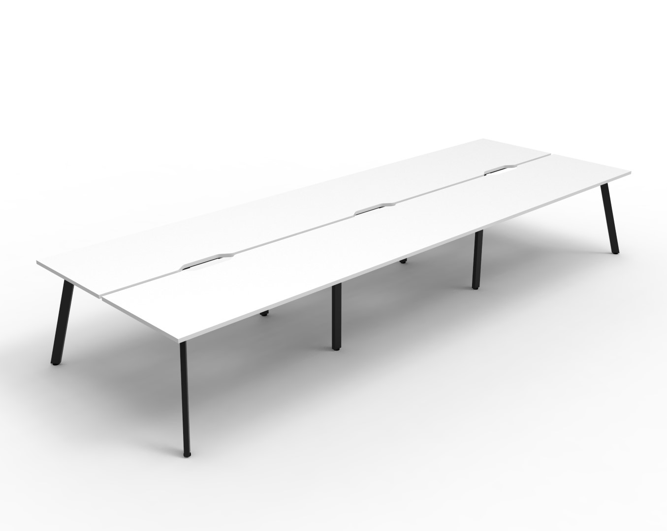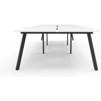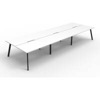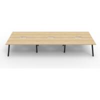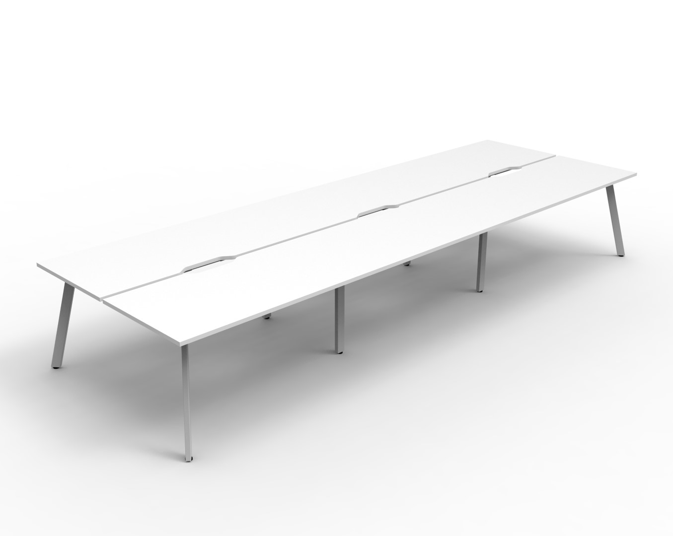 Eternity 6 Person Double Sided Workstation – No Screen | E0 Enviroboard Top With 410mm W x 50mm D Scallop | 30mm Cable Access Void In Between Double Sided Users – Infill Rail Avail. At An Additional Cost | 4500mm W x 1530mm D x 730mm H ( Overall ), 1500mm W x 750mm D x 730mm H Per User | 60mm x 30mm Splayed Leg, P/C Underframe | Adjustable Levelling Feet|Dual Cross Bar For Added Stability