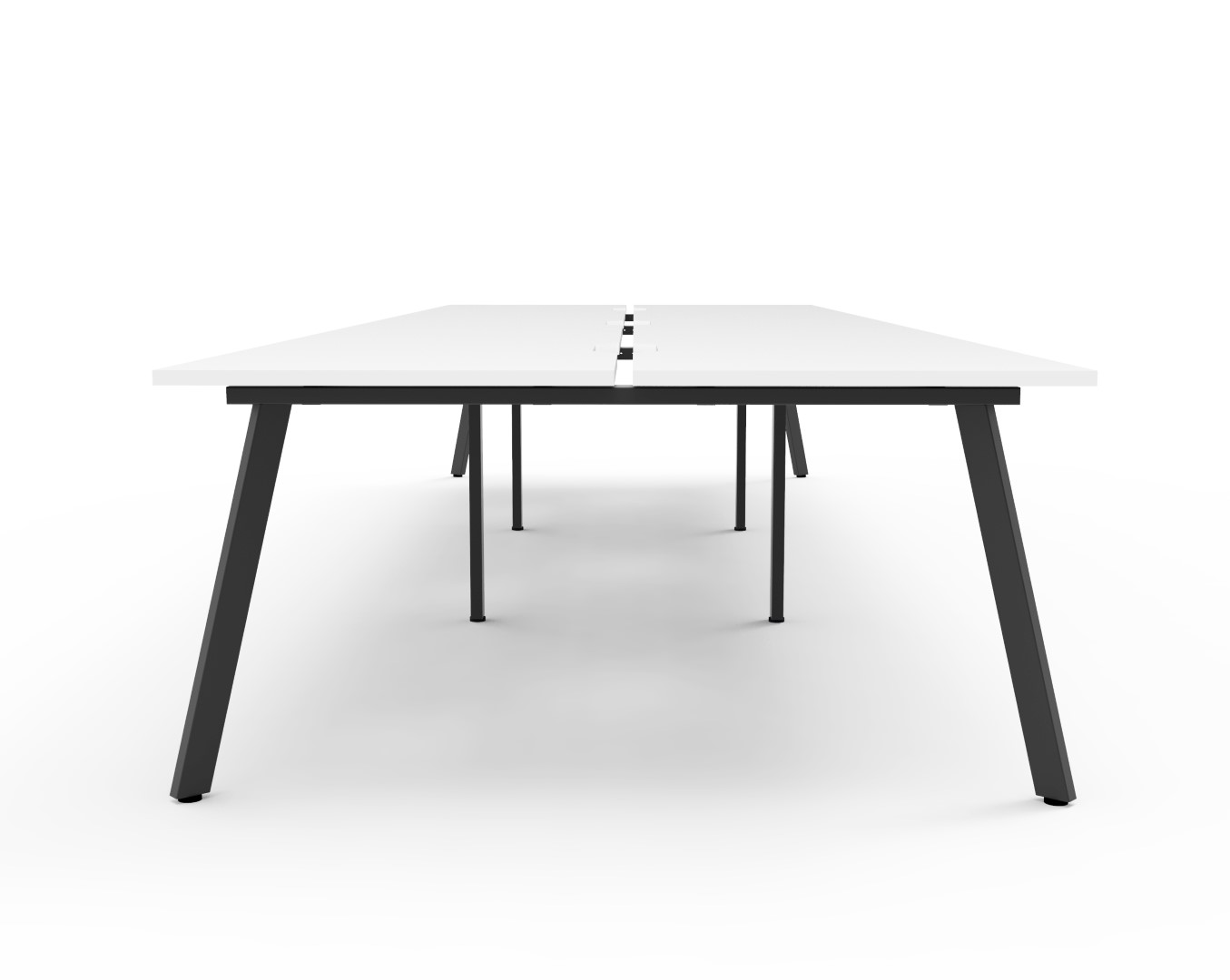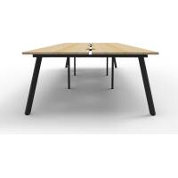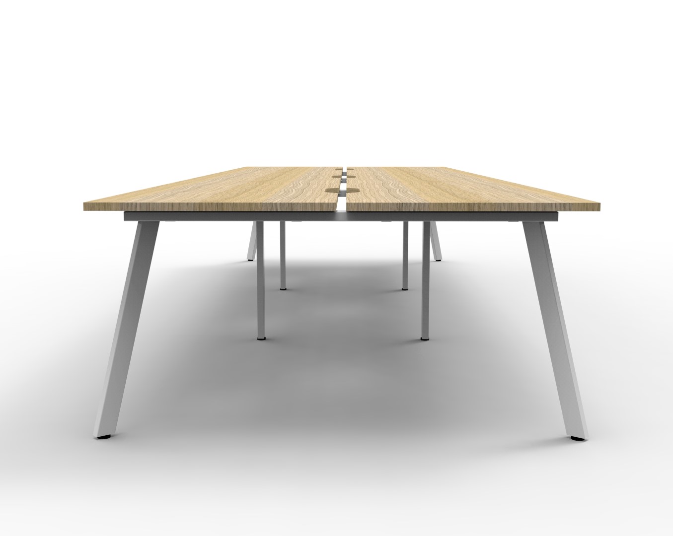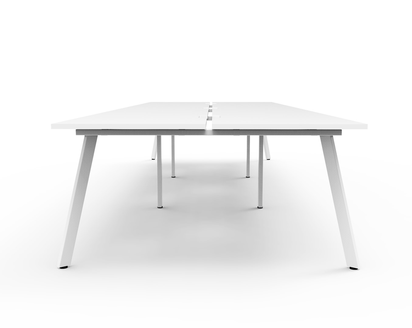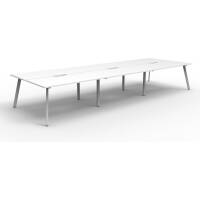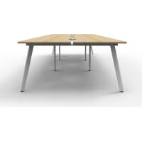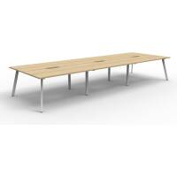 Eternity 6 Person Double Sided Workstation – No Screen | E0 Enviroboard Top With 410mm W x 50mm D Scallop | 30mm Cable Access Void In Between Double Sided Users – Infill Rail Avail. At An Additional Cost | 4500mm W x 1530mm D x 730mm H ( Overall ), 1500mm W x 750mm D x 730mm H Per User | 60mm x 30mm Splayed Leg, P/C Underframe | Adjustable Levelling Feet|Dual Cross Bar For Added Stability