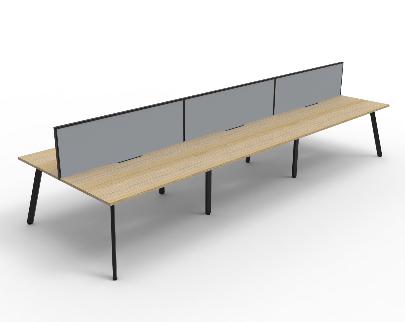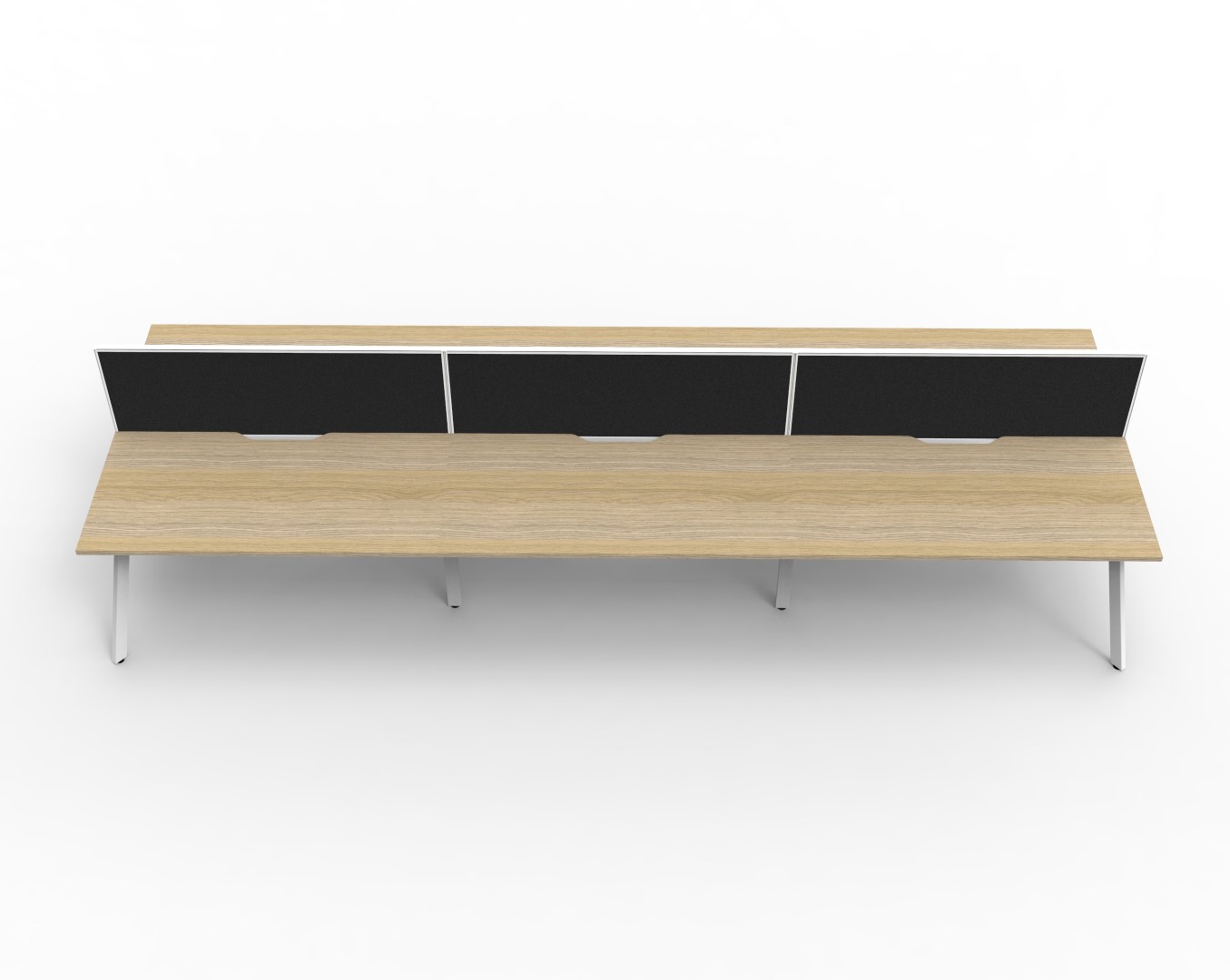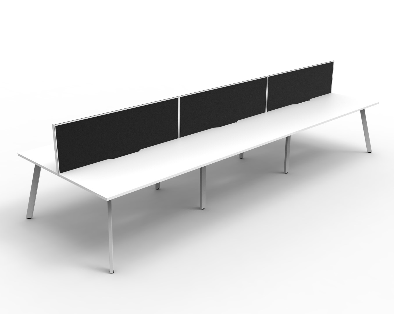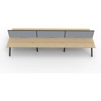E0 Enviroboard Top With 410mm W x 50mm D Scallop Cable Access | 4500mm W x 1530mm D x 1200mm H ( Overall ), 1500mm W x 750mm D x 730mm H Per User | 60mm x 30mm Splayed Leg, P/C Underframe | 495mm H x 30mm T Pinnable Fabric Privacy Screen | Adjustable Levelling Feet|Dual Cross Bar For Added Stability