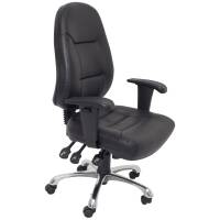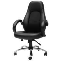 Executive high back chair with a different design. Fabric inlay for extra comfort, chrome base and upholstered arms. Comes with an infinite tilt lock allowing the user to set multiple recline positions.