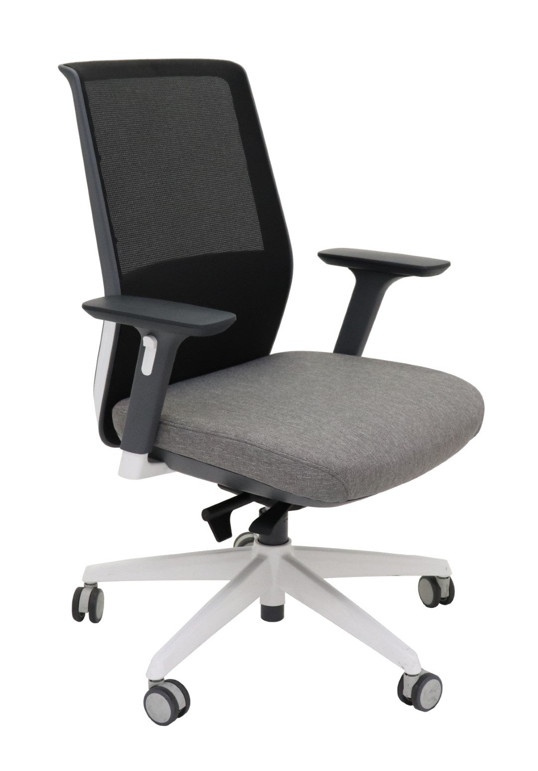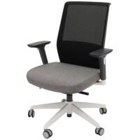 The Motion Mesh Chair is an elegant medium back task chair with black mesh back and light grey upholstered fabric seat.