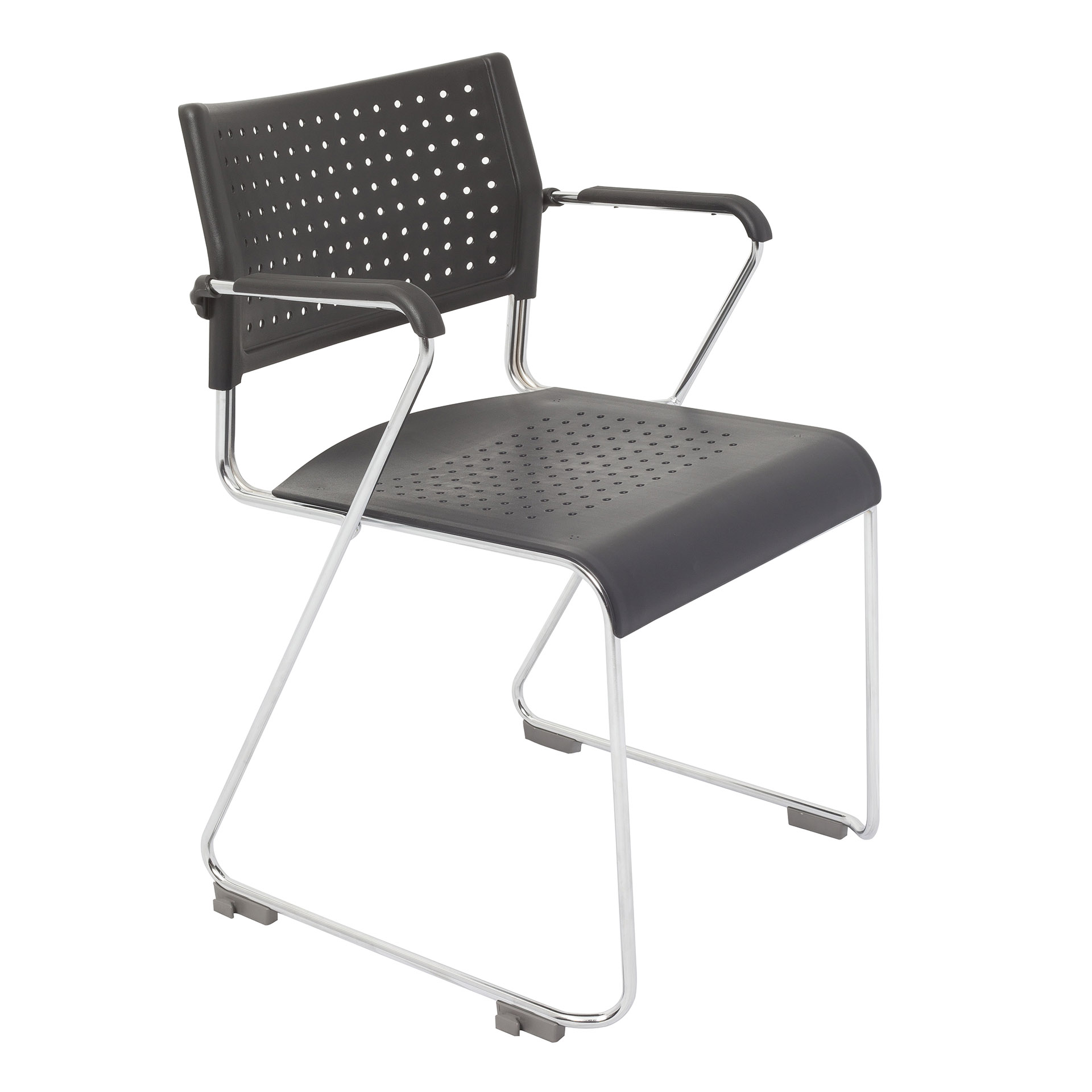 Very versatile chair with arms, black plastic perforated back and waterfall seat and chrome steel rod sled base. The chair stacks and links and has options for a fabric seat or back pad and can be moved with a trolley.