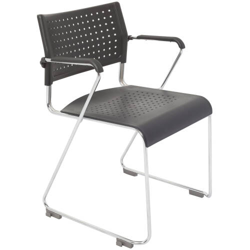 Very versatile chair with black plastic perforated back and waterfall seat and chrome steel rod sled base. The chair stacks and links and has options for a fabric seat or back pad, tablet arm and can be moved with a trolley.