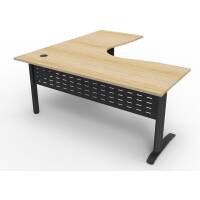 Corner workstations come with an E1 one piece top with cable tidy, perforated metal modesty panel and adjustable feet.